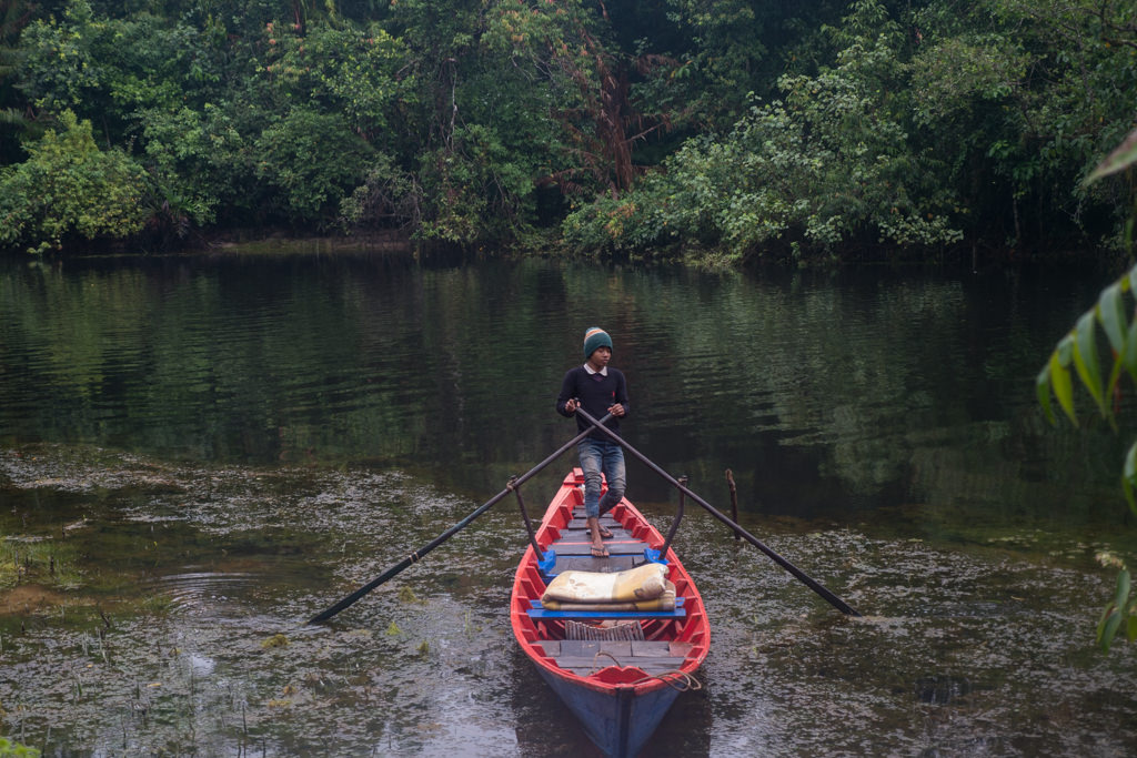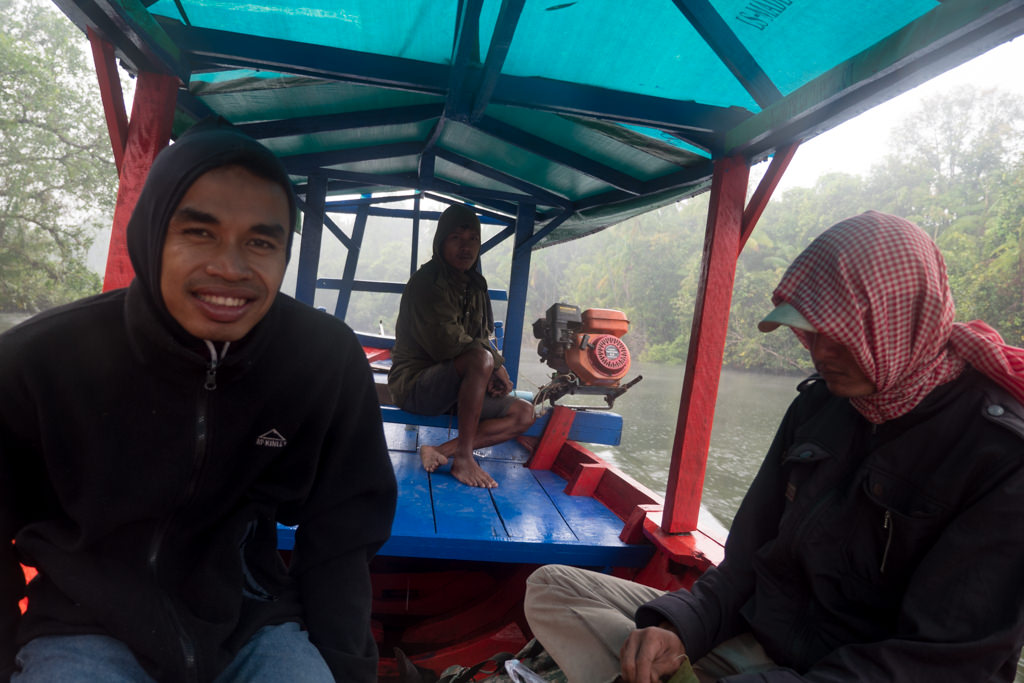 We head out on a long-tail boat deeper into the forest, where we cut the engine and switch to a rowboat for a better chance to see animals. It’s still misty, giving the jungle a spooky vibe.