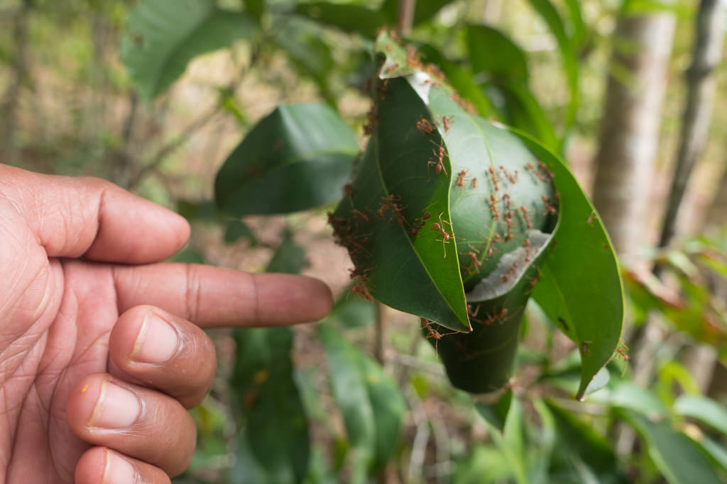 A few hours later we emerge from the thick jungle, stopping in some scrubland on a hill overlooking the valley below. We snack on some green mango with sea salt and chilis. It’s very tasty, and feels a bit like eating a margarita.