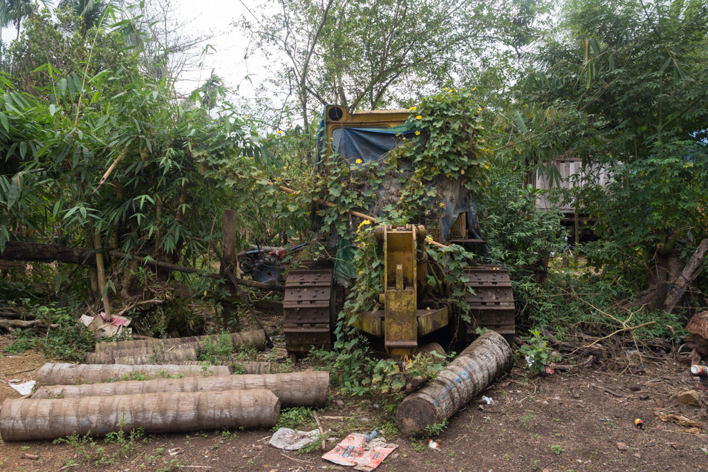 A few more hours later, we arrive back at the village. We stop on the outskirts for a meal at our cook’s home. In his garden, I notice a bulldozer that seems permanently stuck in the bushes.