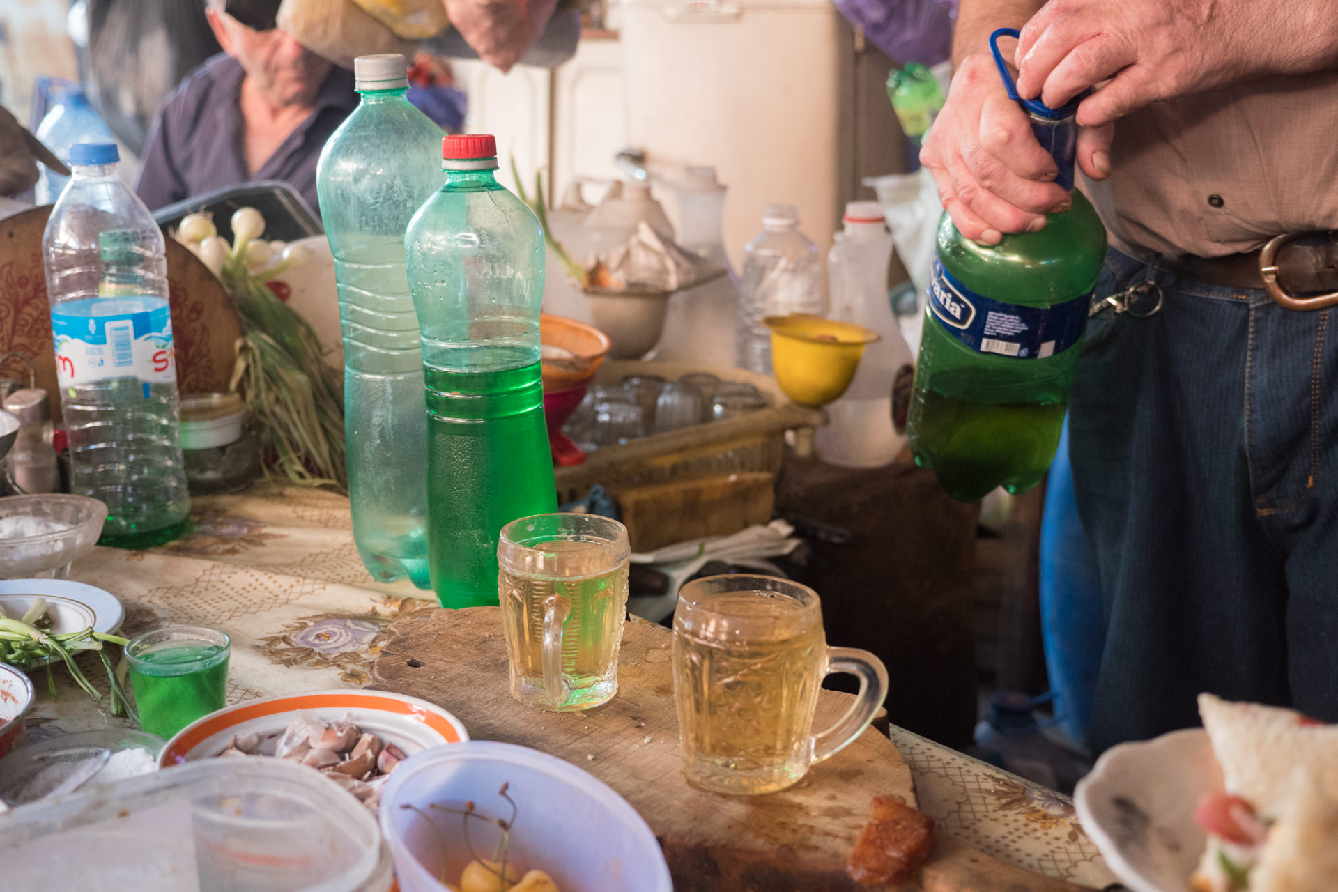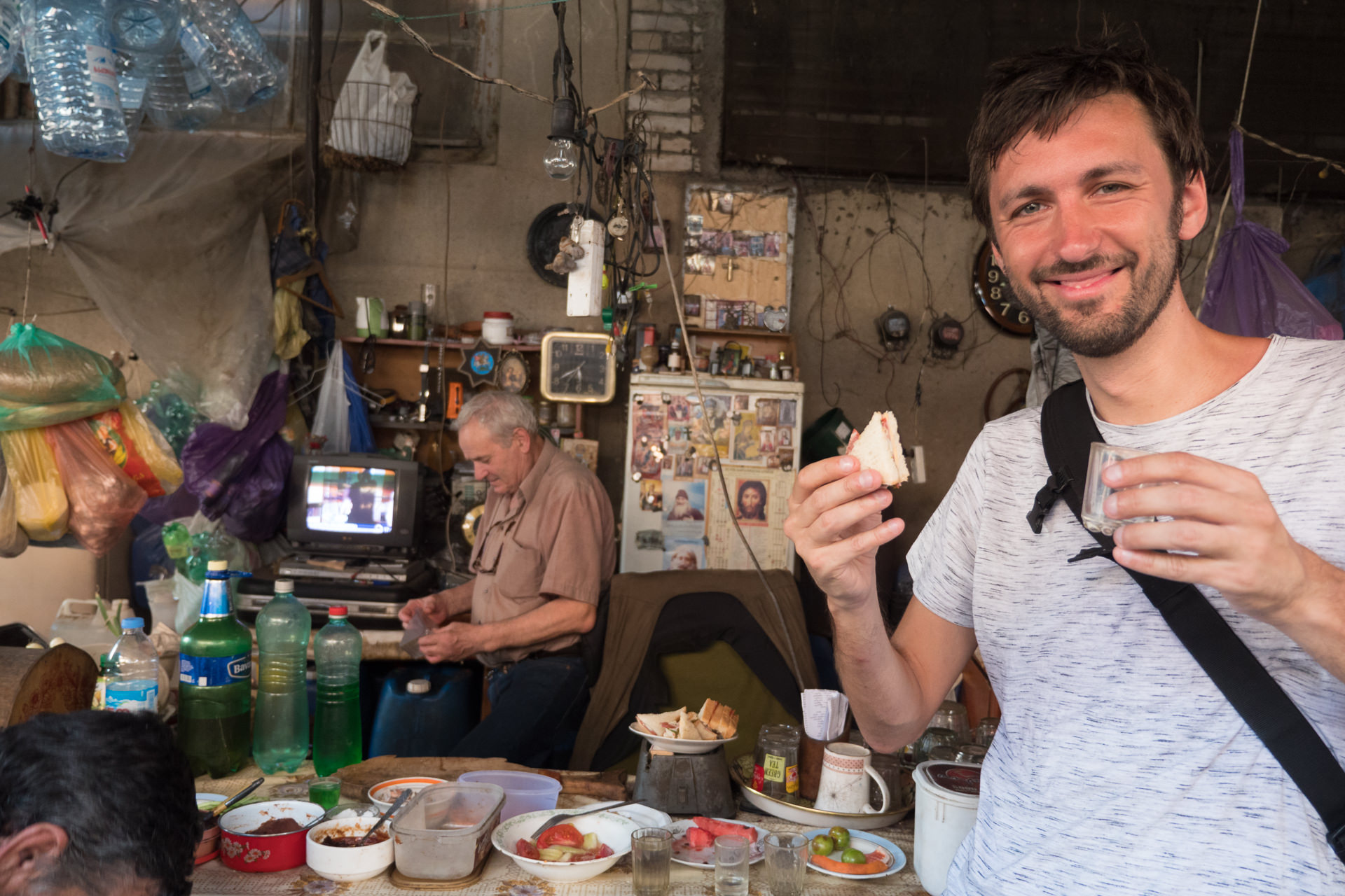 My friend and I eventually ended up in a little alley lined with stalls where Georgians come for a shot and a snack after work. We decided to order some homemade Chacha here, a typical Georgian brandy, followed by some homemade wine (they also let customers pour this into their own plastic bottle to take home). The stalls are a lovely little mess of plates, bottles, pans with snacks, and mugs that may or may not ever get washed. The fridges and CRT TVs in these primitive pubs surely all date back to Soviet times.