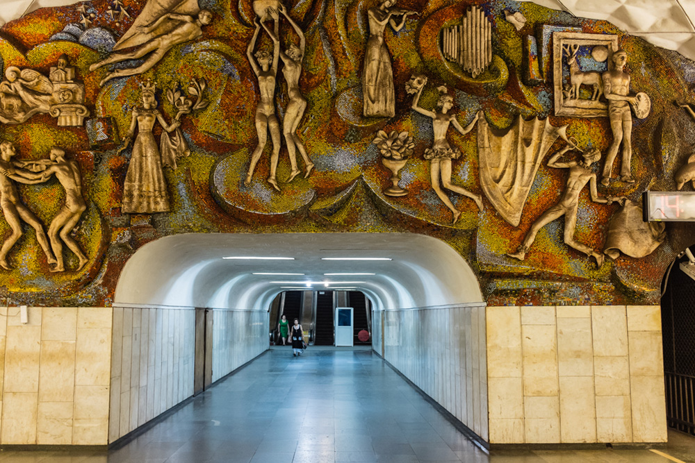 Its vintage escalators have an operator booth at one end, and the tunnel shafts are super deep. It can be a long way down, so I noticed some locals sitting down on the escalator steps while having a break or reading their newspaper. Some of the metro stations have beautiful mosaics, like the University Metro underground station pictured above.