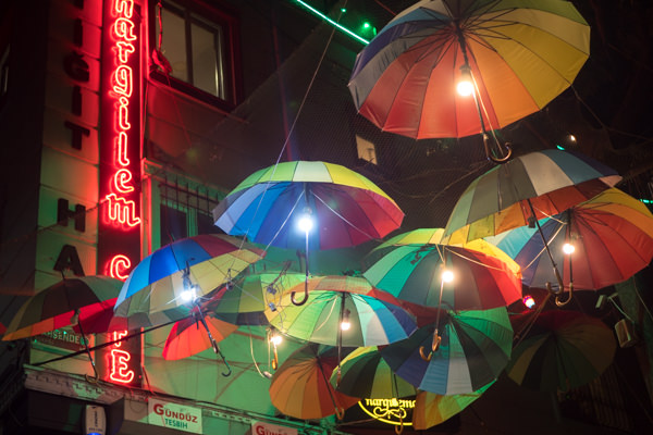 I came upon an alley covered in colored umbrellas which led up to some stairs to a cluster of rooftop bars. I sat myself down on one of the roofs of the Bab-ı Âli Kahvesi cafe [map].
