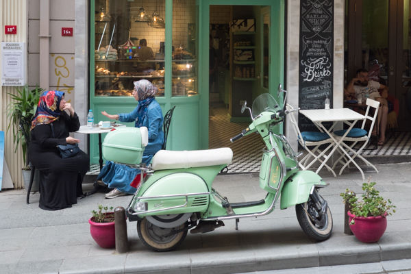 Having covered some of the ancient city and strolled through its parks, by mid-day I felt compelled to cross the Bosphorus river to the other side. I followed the Galata Bridge which, somewhat oddly, encompasses numerous restaurants on its lower level. I then stumbled upon Karaköy [map], a riverside neighborhood filled with funky cafes, ateliers, street art, and little alleys covered with vine roofs.
