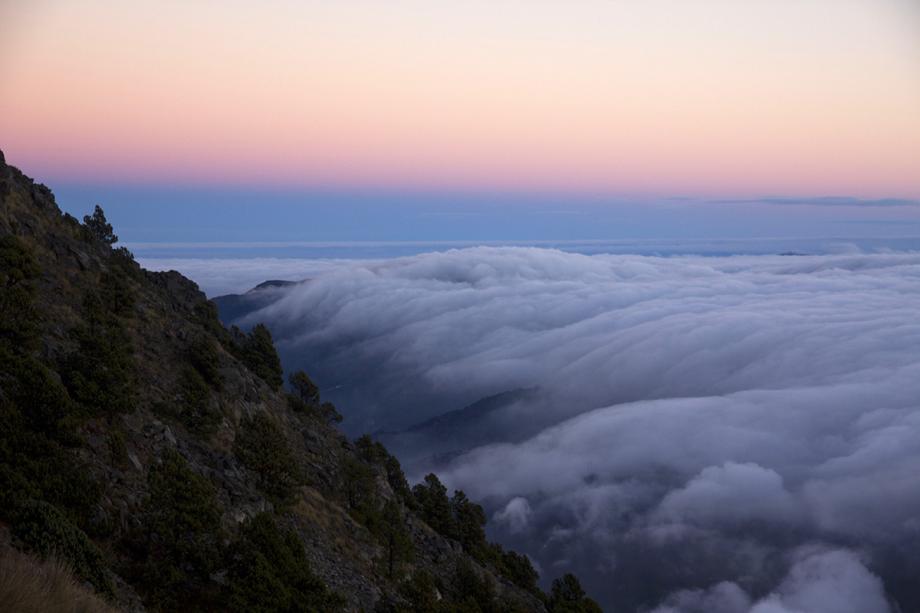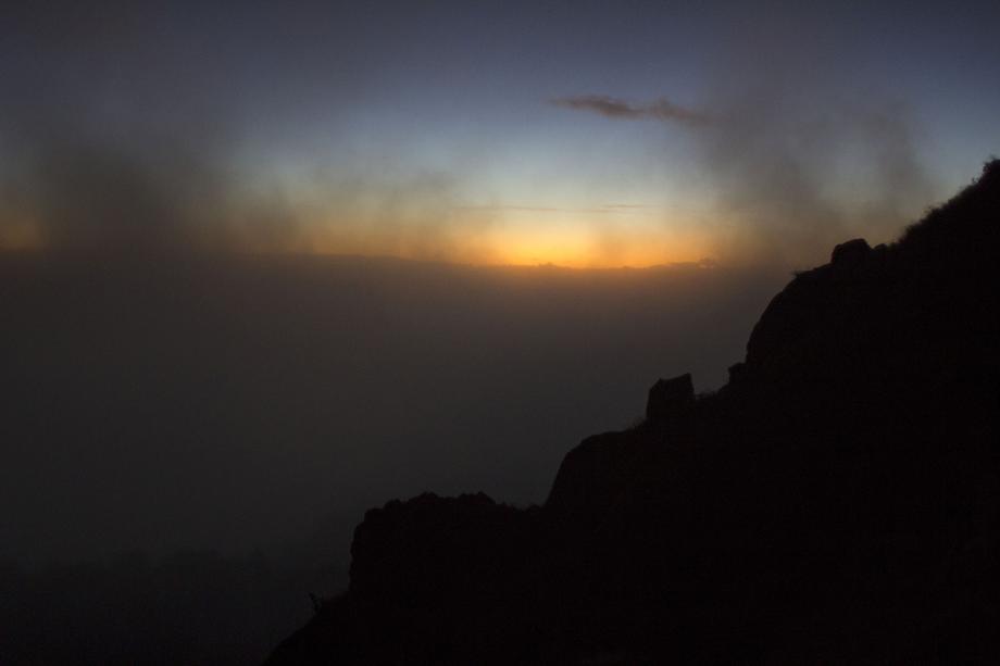 The clouds slowly gliding down the mountain range. I’m feeling the first glow from the sun…