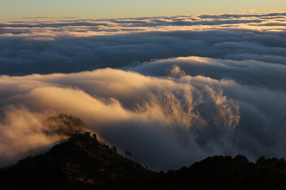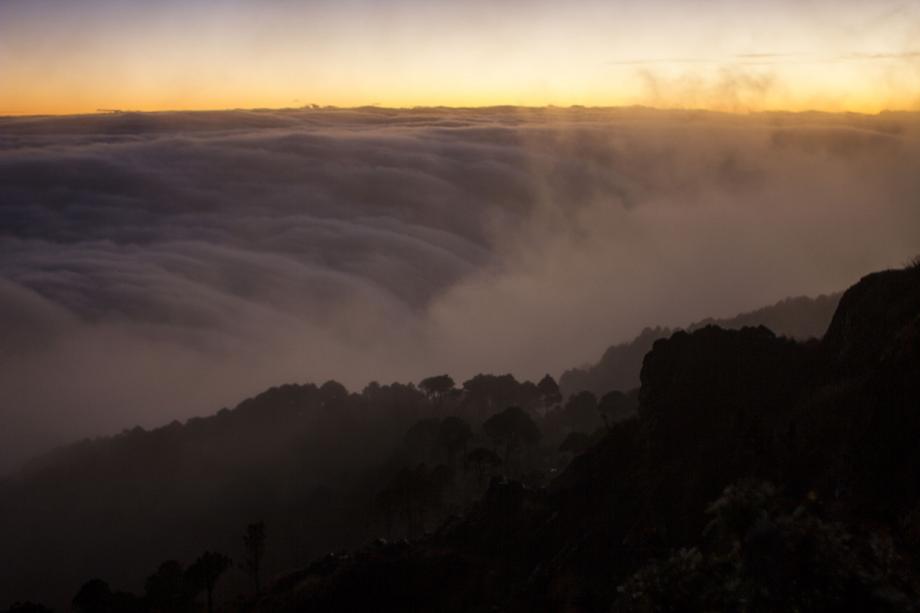The first rays revealing the forest and clouds below.