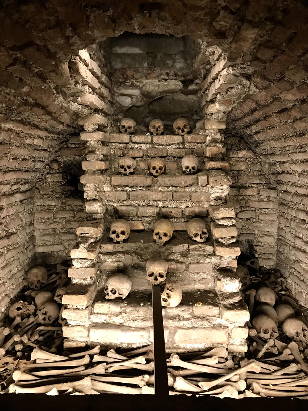 After you’ll then head down into the catacombs below, where you’ll see skulls perched on ledges as well as human bones perfectly arranged in different shapes. Be sure to bring a jumper since it can get quite cold down there.