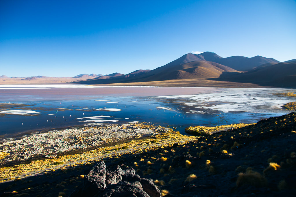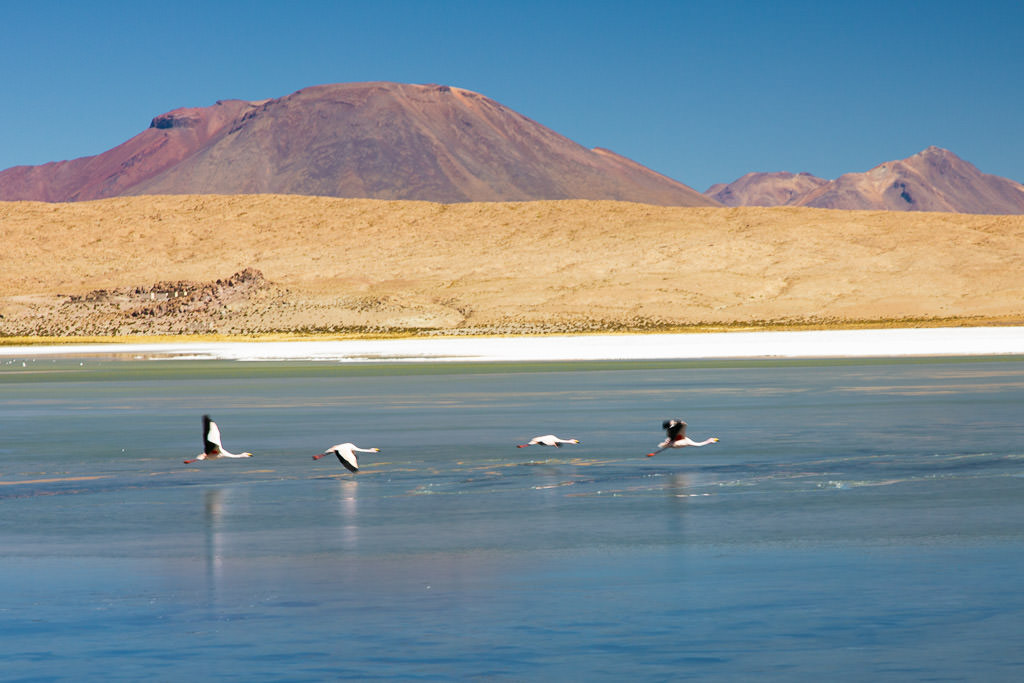 Atacama is also home to several species of pink flamingos which congregate around beautiful coloured lagoons. The microbial and mineral makeup of these lagoons gives each a unique character. One of them even looks bright red during certain times of the day.