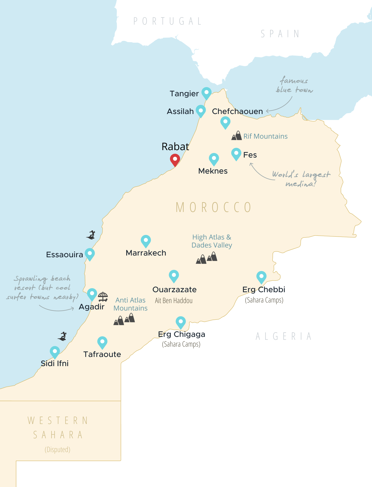 You’re welcome to give any corrections. Note that underneath the map I explain why the Western Sahara isn’t displayed on the map – I’m focusing on the most-visited areas. The general advice for visitors in Morocco is not to expect entry to mosques as a non-Muslim, and I personally found no examples to the contrary. However, if you have more specific information, readers may appreciate you sharing it!