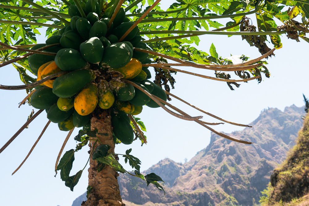 Most of the islands are dry and barren, but some of the ocean-facing valleys on Santo Antao are lush and green, filled with terraced fields and varied cultivation including banana, papaya, mango, and palm trees.