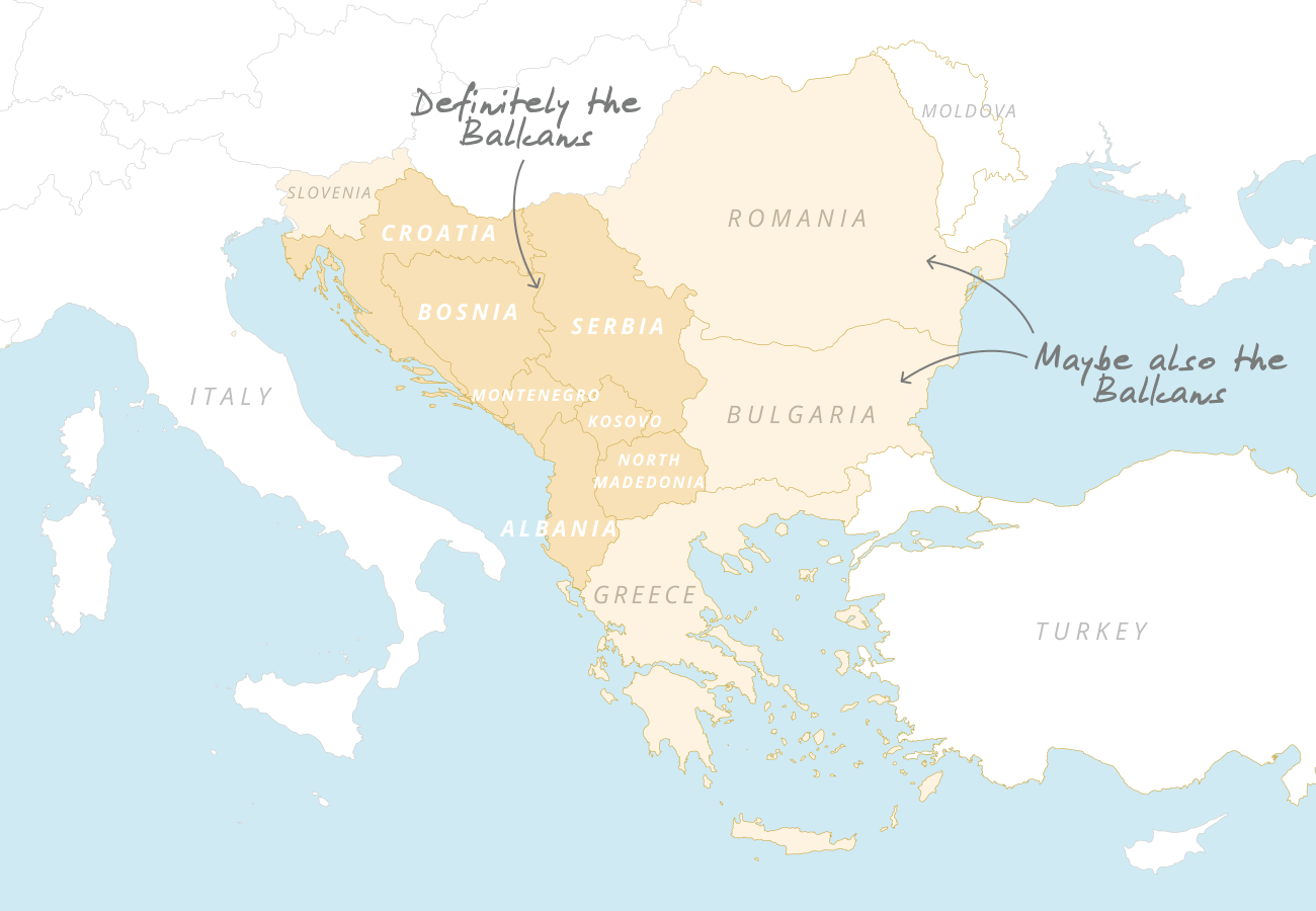 Annoyingly, geographers never settled on where exactly to draw the lines. But broadly speaking, the Balkans refers to the southeastern part of Europe.