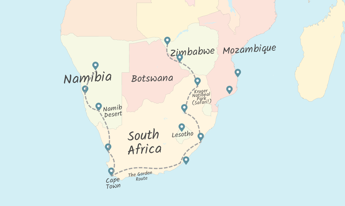South Africa can already take a good six weeks to cover properly; from there you could add on trips to nearby Swaziland and Lesotho, the beaches of Mozambique, the deserts of Namibia, or perhaps even Victoria Falls on the Zambia/Zimbabwe border.