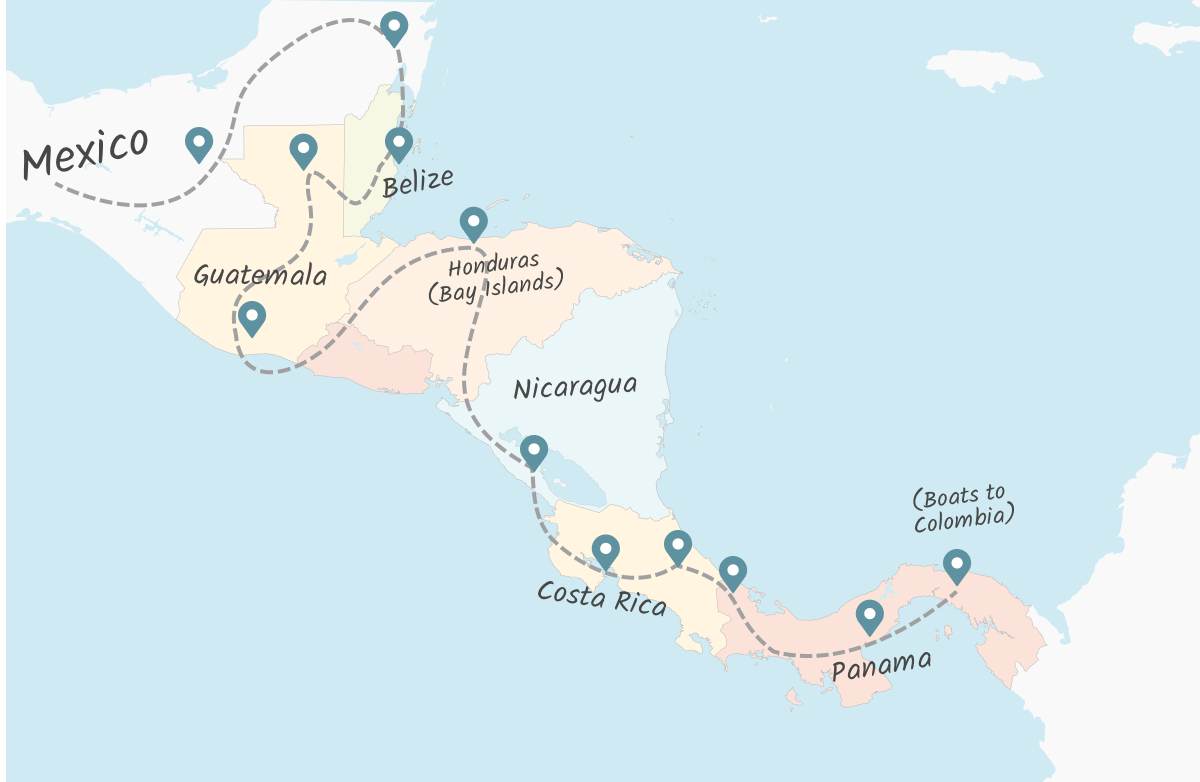 The Gringo Trail is named after the local slang word for a foreigner, and it loosely follows the Pan-American Highway that stretches from Mexico all the way down to Chile—though I’ll talk about just the Central American section first. The perfect amount of time to do this Central American backpacking route justice is 3 months, but I think you could see quite a bit in 6 weeks.