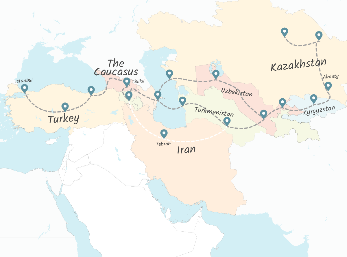 This route starts in Turkey and then moves east into the Caucasus region, passing through Georgia, Armenia, and Azerbaijan. Then it crosses the Caspian Sea into Kazakhstan, potentially reaching as far as Mongolia and remote Western China.