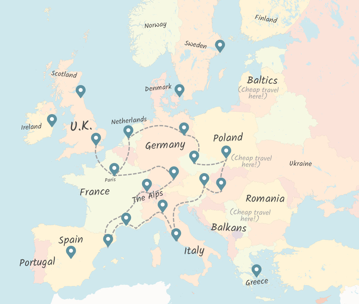 This part of the world is easy to travel in but not exactly cheap, especially in Western or Northern Europe. There also isn’t as much of a typical route: you can pretty much go everywhere from anywhere, and the geography doesn’t really force a particular way through. Instead of one route that everyone does, there are dozens and dozens of ways to travel through Europe.