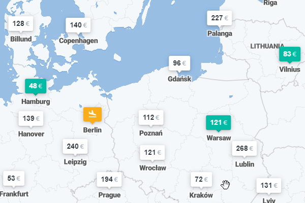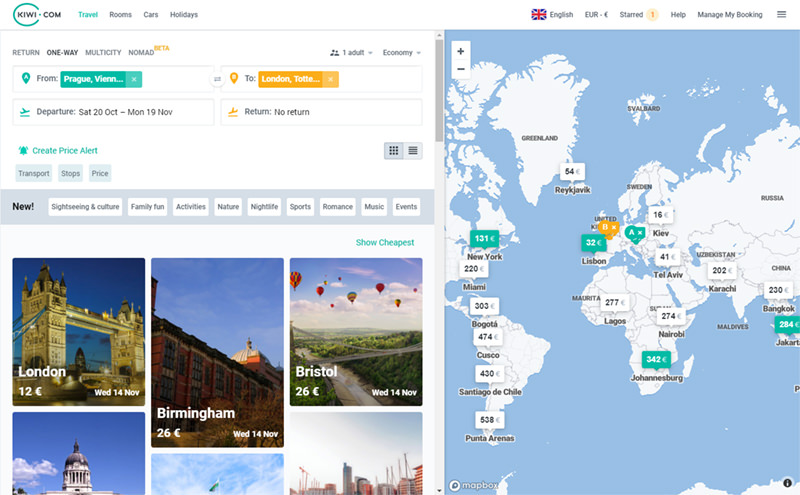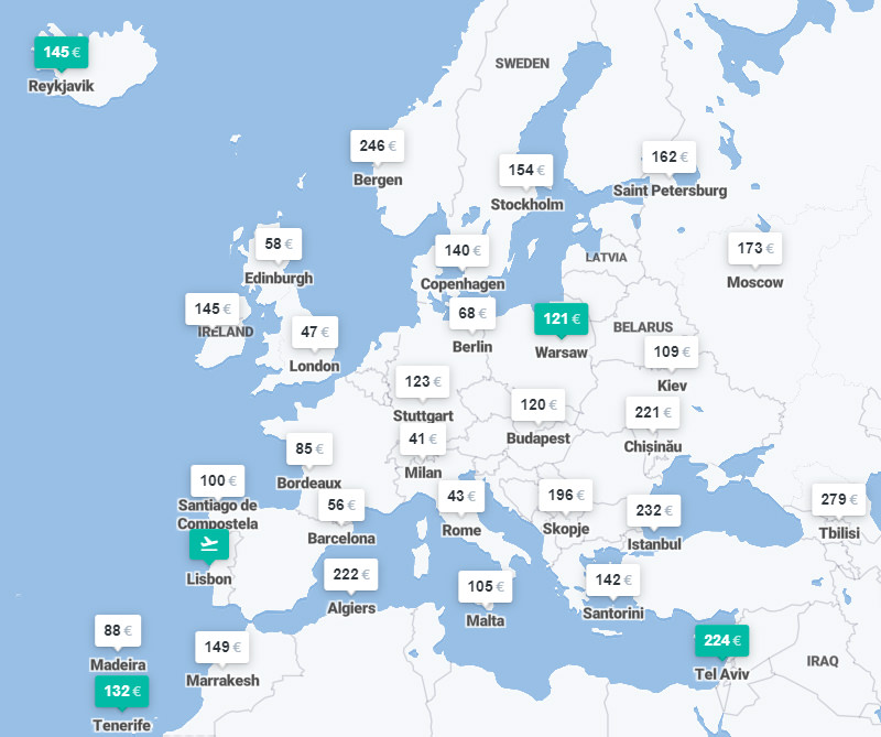 Just try entering ‘anywhere‘ in a search box on Kiwi, Skyscanner or Momondo. Hit the search button and you’ll see a beautiful map with estimated prices.