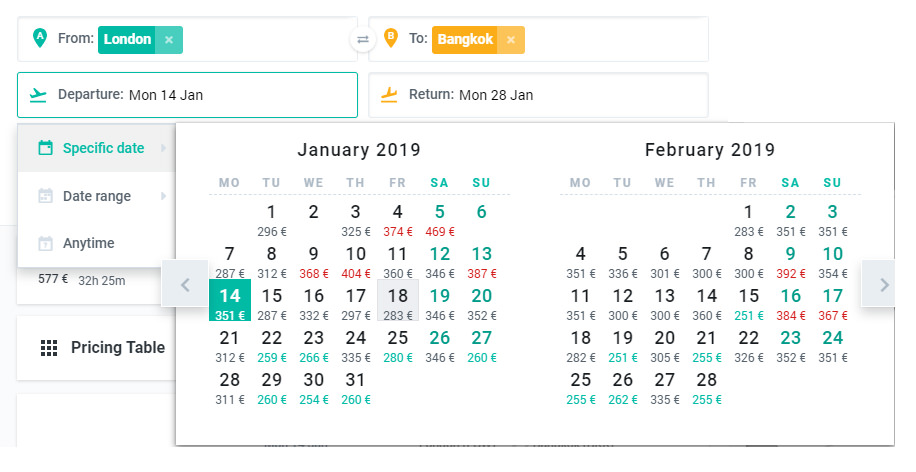 - Hit the Seasonality tab for a graph showing the cheapest and most expensive months of the year to travel this route.